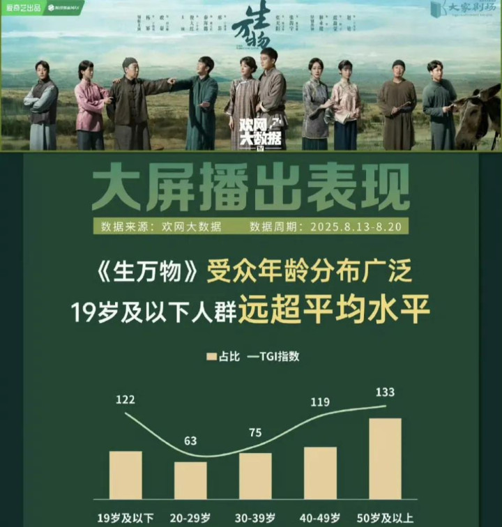 值得一提的是,《生万物》在吸引观众群体上有着出色表现。数据显示,19岁以下观众占比亮眼 ,打破了大众对这类题材受众群体的传统认知。在快节奏的现代生活中,年轻观众习惯了各种快消娱乐内容,但《生万物》凭借其接地气的剧情、鲜活的人物,成功抓住了他们的目光,让他们领略到那个时代的独特魅力。对于年轻观众来说,这部剧不仅是一部简单的电视剧,更是一扇了解历史、感受生活的窗口。